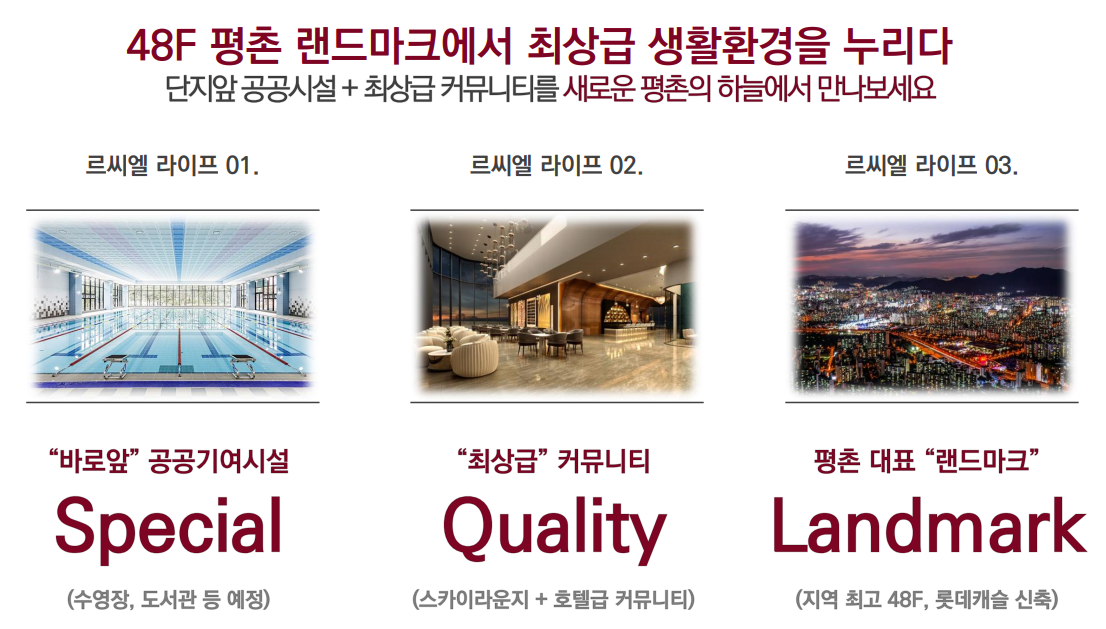 평촌 롯데캐슬 르씨엘은 단순한 주거 공간이 아닌, 평촌의 미래를 선점하고 삶의 품격을 높이는 새로운 '캐슬 라이프'의 시작입니다. 2025년 10월 견본주택 오픈 예정에 맞춰, 관심 고객 등록을 통해 가장 빠르게 정보를 받아보시는 것을 추천드립니다.