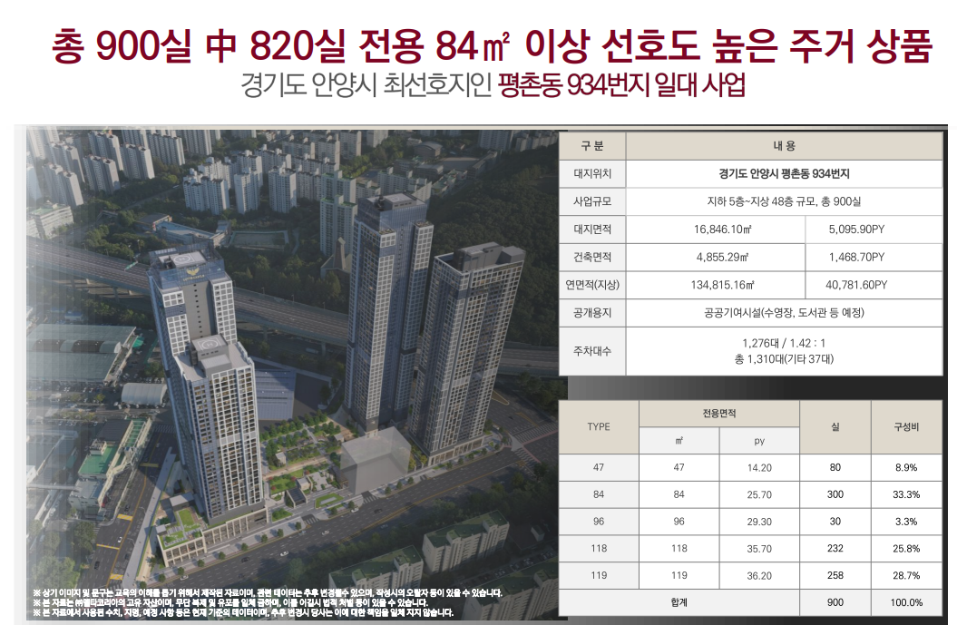 지하 5층~지상 최고 48층, 4개 동, 총 900실 규모로 조성되는 르씨엘은 주변 아파트를 압도하는 지역 최고층 높이를 자랑합니다. 이는 평촌의 새로운 랜드마크로서의 위상을 확립하며, 브랜드 가치와 조망권 프리미엄을 동시에 확보합니다.