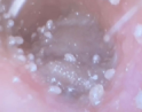 - 내시경 관찰 결과: 오른쪽 외이도 전체에 수많은 흰색 타원형 병변이 이물질과 섞여 관찰되었으며, 심한 염증 소견을 보였습니다.